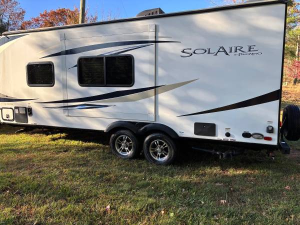 2019 Palomino Solaire 205ss. 23’. 1 slide. Dry weight 4226lbs. Very nice camper. We purchased it slightly used in April of 2020 and have only used it 8-9 times. Always kept parked in covered shed when not in use. Very clean, non-smoker, no pets. Has corner bath with shower, Refrigerator, freezer, microwave, gas oven, stove. Electric tongue jack. Electric lighted awning. Manual stabilizer jacks. Has outdoor radio with tv mount. Has solar power hookup ready. (No solar panels)Very nice unit, we have just outgrown it and do not have time to camp like we would like to. Only thing broken is plastic trim along bottom of shower is broke in a couple places (was like this when we purchased it & is pictured.)Will come with hitch, load bars, sway controller, misc items such as sewer hose, water hose, wheel chocks & flatscreen tv. Always kept winterized during the off season. Never had any issues or leaks.